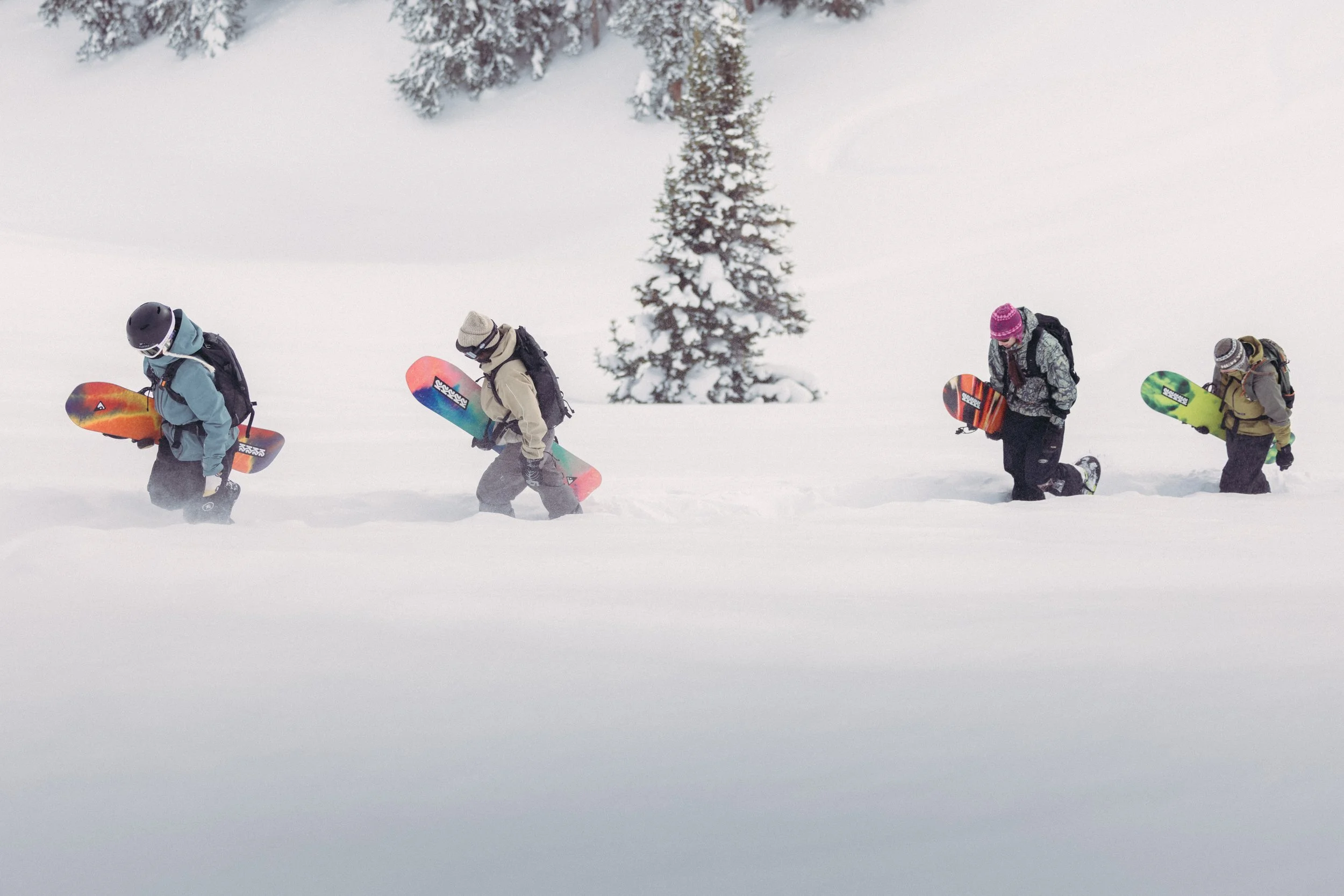 We wanted a marketing layout that broke away from what has become the norm in the outdoor industry over the base few years. We needed a clean layout, that was disruptive at the same time. Something that showcased the world-class riding with the boards and riders all the same. With this in mind, we brought the dynamic artwork from the base of the snowboards to a “disruptive bar” that blasts across the center of the frame. This allowed for us to be bold, apply unique framing whether we needed a full bleed single shot, a multiple framed hybrid, or a close up of the riders themselves.